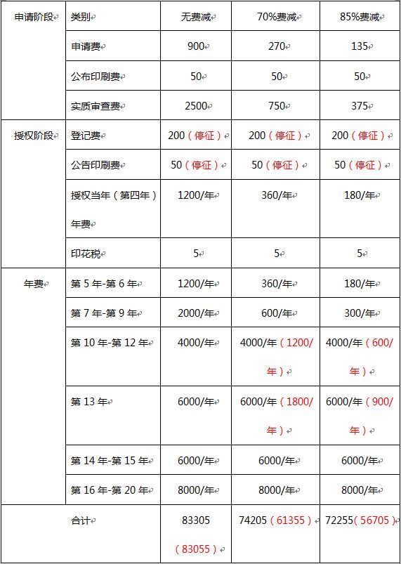 2、對(duì)符合《專利收費(fèi)減繳辦法》(財(cái)稅[2016]78號(hào))有關(guān)條件的專利申請(qǐng)人或?qū)@麢?quán)人,專利年費(fèi)的減繳期限有自授權(quán)當(dāng)年起6年內(nèi),延長(zhǎng)至10年內(nèi)。 3、對(duì)于2018年7月31日(含7月31日)前已準(zhǔn)予減繳的專利,作如下處理:處于授權(quán)當(dāng)年起6年內(nèi)的,年費(fèi)減繳期限延長(zhǎng)至第10年;處于授權(quán)當(dāng)年起7-9年的,自下一年度起繼續(xù)減繳年費(fèi)直至10年;處于授權(quán)年度起10年及10年以上的,不再減繳年費(fèi)。 4、對(duì)進(jìn)入實(shí)質(zhì)審查階段的發(fā)明專利申請(qǐng),在第一次審查意見(jiàn)通知書(shū)答復(fù)期限屆滿前(已提交答復(fù)意見(jiàn)的除外)主動(dòng)申請(qǐng)撤回的,可以請(qǐng)求退還50%的專利申請(qǐng)實(shí)質(zhì)審查費(fèi)。 注意:只有繳納期限屆滿日在2018年8月1日(含8月1日)后,才涉及到相關(guān)費(fèi)種的降費(fèi)、停征;繳納期限屆滿日在2018年8月1日(不含8月1日)前的,不管實(shí)際繳費(fèi)日是哪天,都需要全額按相關(guān)繳費(fèi)通知書(shū)要求繳費(fèi)。 (二)專利費(fèi)用繳納舉例 以發(fā)明專利為例(假設(shè)該發(fā)明專利第四年授權(quán)) 注:黑色表示按2018年8月1日前政策計(jì)算的費(fèi)用,紅色表示按照局272號(hào)公告應(yīng)繳納的費(fèi)用。 (三)繳費(fèi)相關(guān)系統(tǒng)切換時(shí)間 1、7月30-31日之間網(wǎng)上繳費(fèi)系統(tǒng)、專利繳費(fèi)信息網(wǎng)上補(bǔ)充與管理系統(tǒng)暫停服務(wù)。在此期間代辦處可正常開(kāi)展收費(fèi)業(yè)務(wù),但無(wú)法調(diào)取補(bǔ)繳訂單。 2、8月1日-8月31日之間期限屆滿日在7月31日(含7月31日)之前的登記費(fèi)及公告印刷費(fèi)應(yīng)按舊費(fèi)種繳納,期限屆滿日在8月1日之后按《公告》要求繳納。 2018年8月1日網(wǎng)上繳費(fèi)系統(tǒng)及網(wǎng)上補(bǔ)充繳費(fèi)系統(tǒng)切換至新系統(tǒng),如繳費(fèi)人在8月1日前下載舊模板并在8月1日后使用舊模板填寫(xiě)并上傳,系統(tǒng)將會(huì)報(bào)錯(cuò)。 2018年8月31日后全部切換,9月1日后任何界面不能提交停征的費(fèi)種。若再遇到需要繳納登記費(fèi)及公告印刷費(fèi)的情形(如期限屆滿日在7月31日(含7月31日)之前的繳費(fèi))時(shí),費(fèi)用無(wú)法按舊費(fèi)種采集,窗口工作人員在采集時(shí)會(huì)進(jìn)行依職權(quán)分費(fèi)處理。 注意: (1)窗口繳費(fèi)補(bǔ)繳:7月30日至7月31日補(bǔ)繳系統(tǒng)無(wú)法正常使用,請(qǐng)繳費(fèi)人盡量提前繳費(fèi);如確需在這兩天繳費(fèi),可手填繳費(fèi)清單繳納費(fèi)用。 (2)銀行、郵局匯款補(bǔ)繳:7月30日至7月31日補(bǔ)繳系統(tǒng)和網(wǎng)上繳費(fèi)無(wú)法正常使用,如繳費(fèi)人通過(guò)銀行、郵局匯款,需通過(guò)傳真或郵件補(bǔ)充繳費(fèi)信息。 (3)登記費(fèi)和公告印刷費(fèi)的繳費(fèi)屆滿日在7月31日(含7月31日)之前,但未繳足費(fèi)用導(dǎo)致逾期視為放棄取得專利權(quán)的,在8月1日之后辦理恢復(fù)手續(xù)時(shí)還應(yīng)繳納登記費(fèi)和公告印刷費(fèi)。 |  |