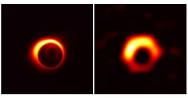 圖注:這是先前由計算機(jī)模擬生成的M87星系中心黑洞兩種可能的樣子。 計算表明,看清銀河系中心的黑洞,需要53微角秒的角分辨率,看清M87星系中心的黑洞,則需要22微角秒的角分辨率,都落在了事件視界望遠(yuǎn)鏡的觀測能力范圍內(nèi)。因此,銀河系中心黑洞的視直徑比M87星系中心黑洞的視直徑要大一些。