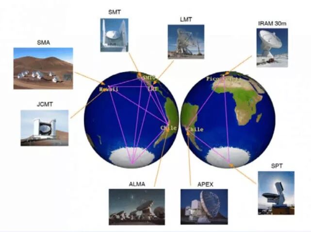 圖注:分布在全球的8座毫米波亞毫米波射電望遠(yuǎn)鏡虛擬出一個地球大小的“事件視界望遠(yuǎn)鏡” 從位于西班牙的口徑30米的毫米波望遠(yuǎn)鏡(IRAM 30-meter telescope),到位于夏威夷的兩座射電望遠(yuǎn)鏡,再到位于南極洲的南極望遠(yuǎn)鏡(South Pole Telescope)等都參與了這場偉大的觀測。這8座毫米/亞毫米波射電望遠(yuǎn)鏡分別為: 位于西班牙內(nèi)華達(dá)山脈的30米毫米波望遠(yuǎn)鏡(IRAM 30m); 位于美國亞利桑那州的海因里?!ず掌潄喓撩撞ㄍh(yuǎn)鏡(SMT); 位于墨西哥一座死火山頂部的大型毫米波望遠(yuǎn)鏡(LMT); 位于夏威夷的詹姆斯·克拉克·麥克斯韋望遠(yuǎn)鏡(JCMT); 位于夏威夷的亞毫米波陣(SMA); 位于智利沙漠的阿塔卡馬大型毫米波陣(ALMA); 位于智利沙漠的阿塔卡馬探路者實驗望遠(yuǎn)鏡(APEX; 位于南極阿蒙森·斯科特觀測站的南極望遠(yuǎn)鏡(SPT);