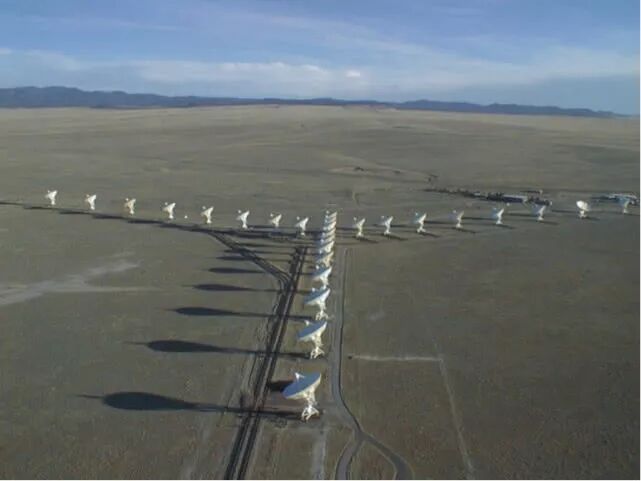 圖注:美國的甚大天線陣(VLA)。每個天線重230噸,架設(shè)在鐵軌上,可以移動。 基于綜合孔徑技術(shù)的射電望遠(yuǎn)鏡以美國的甚大天線陣(Very Large Array,縮寫為VLA)為代表,它是由27臺25米口徑的天線組成的射電望遠(yuǎn)鏡陣列,位于美國新墨西哥州的圣阿古斯丁平原上,海拔2124米,是世界上最大的綜合孔徑射電望遠(yuǎn)鏡。甚大天線陣每個天線重230噸,架設(shè)在鐵軌上,可以移動,所有天線呈Y形排列,每臂長21千米,組合成的最長基線可達(dá)36千米。甚大天線陣隸屬于美國國家射電天文臺(NRAO),于1981年建成,工作于6個波段,最高分辨率可以達(dá)到0.05角秒,與地面大型光學(xué)望遠(yuǎn)鏡的分辨率相當(dāng)。這座射電望遠(yuǎn)鏡陣列還經(jīng)常在影視劇中出現(xiàn),例如1997年,著名的科幻電影《接觸》中就有VLA的身影。
