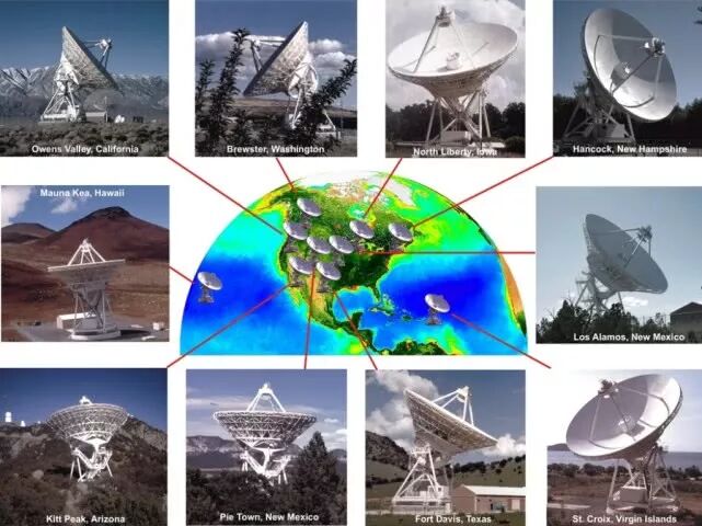 圖注:VLBA由10個拋物天線構(gòu)成,橫跨從夏威夷到圣科洛伊克斯8000多千米的距離。 目前,基于甚長基線干涉原理最有名的是美國的超長基線陣列(Very Long Baseline Array,縮寫為VLBA),是由位于美國新墨西哥州索科洛的美國國家射電天文臺陣列操作中心遙控的射電望遠(yuǎn)鏡陣列。VLBA由10個拋物天線構(gòu)成,橫跨從夏威夷到圣科洛伊克斯8000多千米的距離,其精度是哈勃太空望遠(yuǎn)鏡的500倍,是人眼的60萬倍。 甚長基線干涉觀測的分辨率是其它任何望遠(yuǎn)鏡所無法比擬的,在天文學(xué)的研究方面,觀測課題集中在射電噴流、黑洞、射電源演化、銀河系和河外星系微波脈澤源、引力透鏡、超新星遺跡、近處和遠(yuǎn)處的星暴星系、暗弱射電源特性以及在活動星系核中的中性氫吸收。最有顯示度的觀測成果是對超大質(zhì)量黑洞候選體的觀測研究,這是因為黑洞的尺度非常小。目前VLBA觀測最成功的有3例,分別為銀河系中心、橢圓星系M87和塞弗特星系NGC4258中的超大質(zhì)量黑洞候選體。 甚長基線干涉測量技術(shù)不僅在天體物理,而且在天體測量、大體測量等領(lǐng)域都有著廣泛的應(yīng)用。 為什么不采用光學(xué)望遠(yuǎn)鏡進(jìn)行觀測? 我們知道,人眼能夠看到的光線稱為可見光,是電磁波譜的一部分,頻率范圍從430太赫茲到750太赫茲,相應(yīng)的波長范圍從400納米到700納米。 射電望遠(yuǎn)鏡就是利用射電波進(jìn)行觀測的望遠(yuǎn)鏡,射電波也是電磁波譜的一部分,頻率范圍從高頻的300吉赫茲到低頻的30赫茲,相應(yīng)的波長范圍從1毫米到10000公里。在自然界,從閃電到宇宙天體都會發(fā)出射電波。
