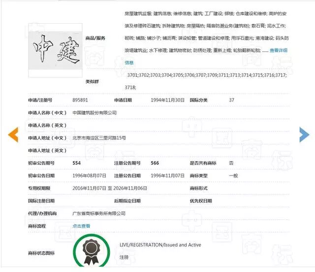 據(jù)了解,中國建筑公司是第5640152號(hào)、第895891號(hào)“中建”商標(biāo)的合法權(quán)利人。